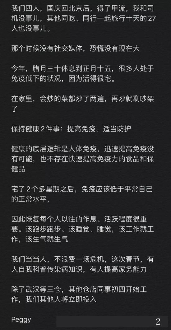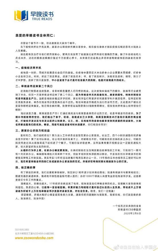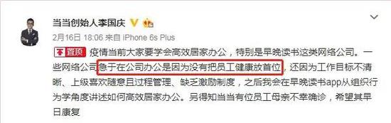 很巧的是,李国庆2月9日在微博上晒出了他2月6日发给公司的内部信,他表示:居家是对抗疫的贡献,但中小企业活下去才是对社会的贡献,企业要未雨绸缪如何打赢中小企业保卫战?为了员工和他人安全着想,延迟至2月20日返京,返京后隔离14天在家办公,你们的健康和居家办公都是第一位的!