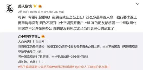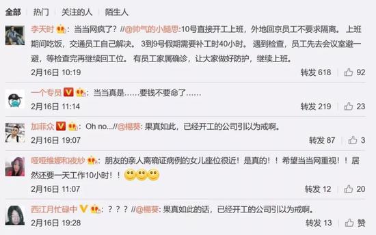 2月16日,自称当当网员工的微博网友“小E同学奔狗士”发文称:“当当员工的母亲感染,该员工作为亲密接触者曾多日去公司上班,当当不按国家14天隔离规定坚持要求员工上班。另外国家规定3-7日假期,当当要求加班40小时补回来!”