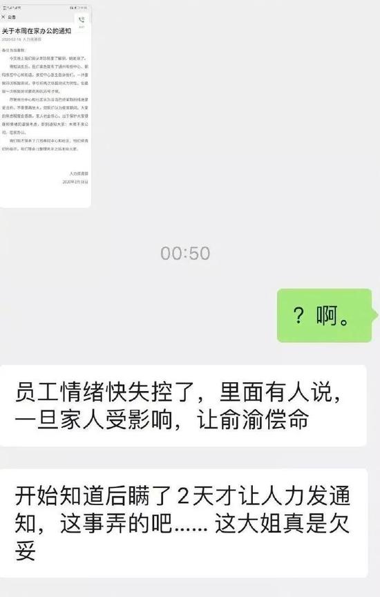 里面有人说,一旦家人受到影响,让俞渝(当当网董事长兼CEO)偿命。她还说:开始知道后瞒了两天才让人力资源部发通知,这事弄的吧……,这大姐(俞渝)真是欠妥。