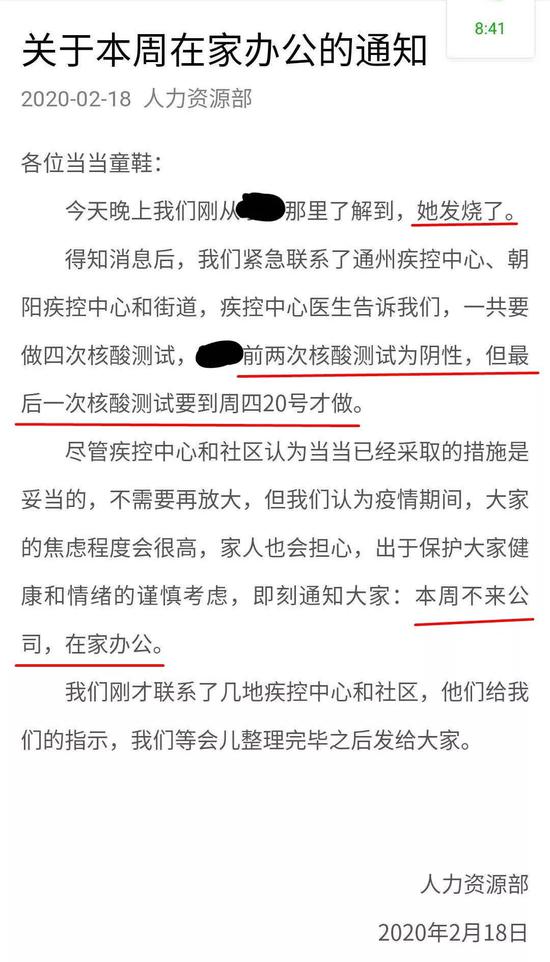 第三,在员工母亲确诊之后,仍然发通知让大家不要恐慌,继续在公司上班。要知道广州珠江新城写字楼职员确诊新冠肺炎,该职员被确诊送医后,公司全体被隔离。