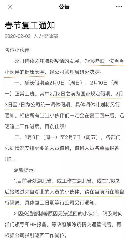 2月2日,一名当当网员工在脉脉上贴出一张当当《春节复工通知》的图片,通知显示:当当为了每一位小伙伴的健康,延长假期至2月9日,2月10日正常上班。其中,2月3日至7日,是公司统一调休假期。